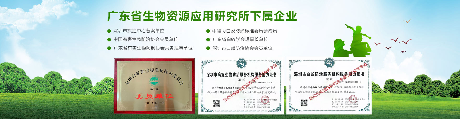 深圳市程建白蟻防治中心有限公司(深圳市白蟻防治中心、深圳市殺白蟻公司、滅白蟻公司、治白蟻公司、除白蟻公司、防白蟻公司、深圳市消殺公司、深圳市殺蟲(chóng)公司)、于二00二年十一月成立。是經(jīng)深圳市政府有關(guān)部門批準(zhǔn),市工商行政管理局注冊(cè)登記的法人企業(yè),深圳市蟲(chóng)鼠防治協(xié)會(huì)(PCO)成員單位,持有政府部門頒發(fā)“白蟻防治服務(wù)機(jī)構(gòu)服務(wù)能力證書B(niǎo)級(jí)”、“有害生物防制服務(wù)機(jī)構(gòu)服務(wù)能力證書B(niǎo)級(jí)”雙資質(zhì)證書的有害生物防治單位。公司主要服務(wù)政府、事業(yè)、企業(yè)、工廠、賓館、園林、小區(qū)、大廈等單位的白蟻防治、有害生物防制施工的專業(yè)機(jī)構(gòu)。技術(shù)力量雄厚,擁有各層次專業(yè)技術(shù)人員三十多名。